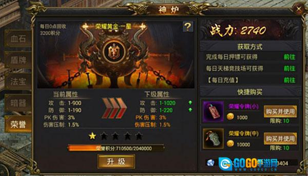 可快速提升战力,除了提高攻击和防御外,还能增加PK伤害和伤害压制。攻击荣誉低于自己的玩家,额外增加伤害。荣誉积分可以通过参加活动获得。