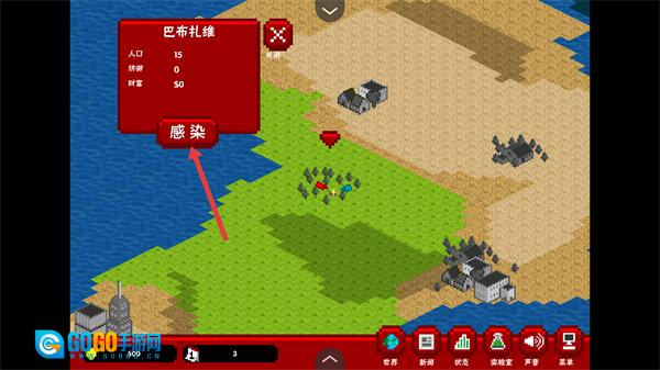 1、在区域界面(例如巴布札维)点击【感染】按钮进入关卡,查看该区域的人口数量、控制率等相关数据,为接下来的感染行动做准备。