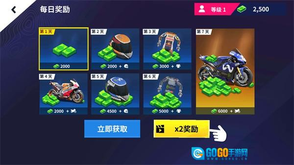 新人每日签到均可领取福利,累计可签到7天,所获奖励可用于购买摩托车、头盔等物品。