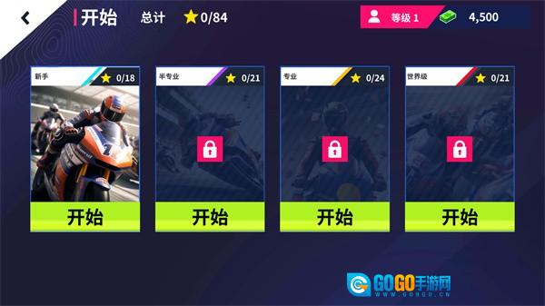 关卡难度划分为新手、半专业、专业和世界级四个等级,若想完成所有挑战,还需掌握更多驾驶技巧。