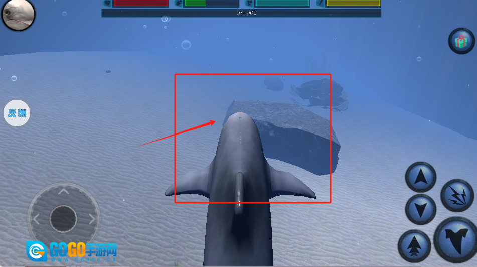 操控鲸鱼游动,避开礁石,可通过右下角的按钮进行互动或发动攻击。
