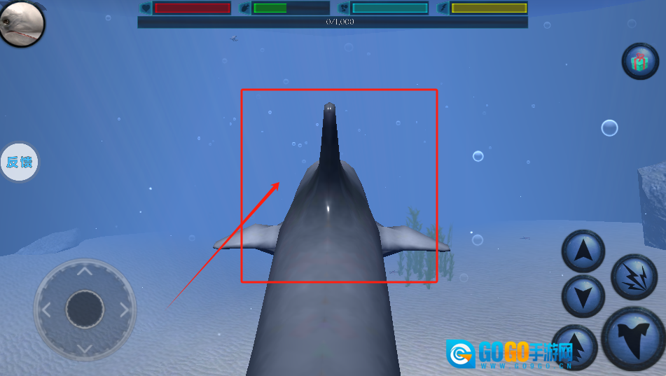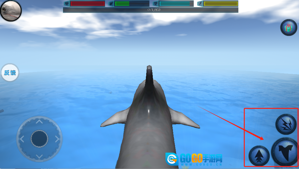 操控鲨鱼在水中游动,留意状态条,点击下方按钮进行攻击或释放技能。
