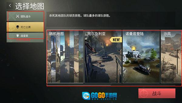 3、可以选择游戏的模式,有团队战斗、死亡比赛和战皇家三种模式,接着选择地图,点击战斗;