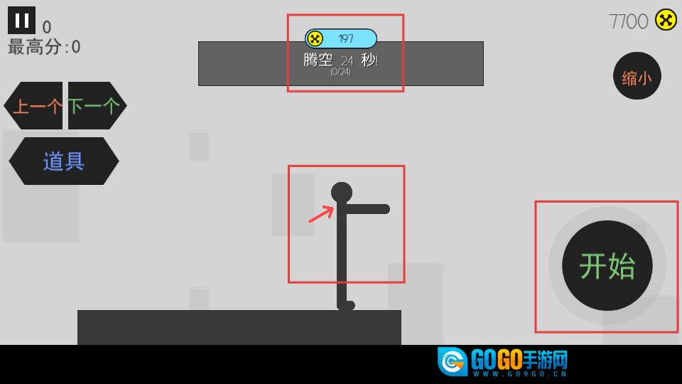 在对局界面,先确认火柴人的位置以及腾空进度条的状态,再检查上一个、下一个功能和道具功能是否可用,最后点击开始按钮来启动火柴人的行动流程。