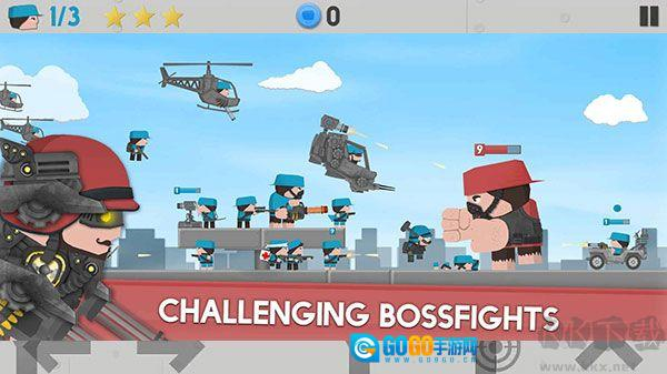 每次发射三发子弹,威力稍强一些。使用方法很简单:跳跃——在枪口即将和敌人处于同一直线时——射击。对付机枪时,可贴近机枪射程边缘,走进射程开三枪后立刻退回原位,这种方式能无伤解决不少兵种。能击杀的兵种包括双枪兵、双刃兵、喷火兵、机枪兵、散弹兵等。到了后期的一些关卡,用两个双枪兵加一个步枪兵就能轻松达成三星通关。