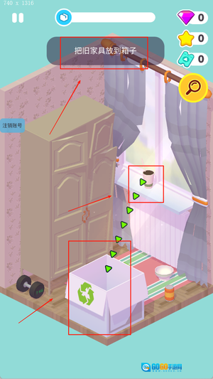 2、需对物件进行收纳整理,界面上方会展示当前的资金数额与任务进展情况。
