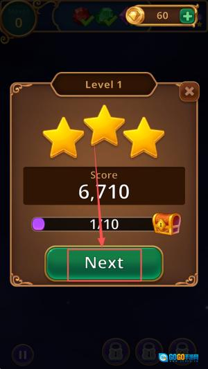 4、领取奖励:通关后查看结算页的60分和6710积分,点击“Next”进入下一关。