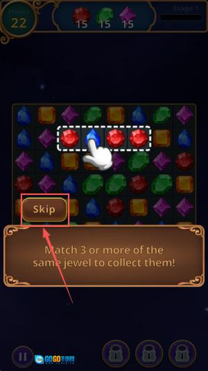 2、学习规则:在关卡提示页面仔细阅读“Skip”相关说明,牢记只要将三颗相同颜色的宝石连接起来就能完成消除操作。