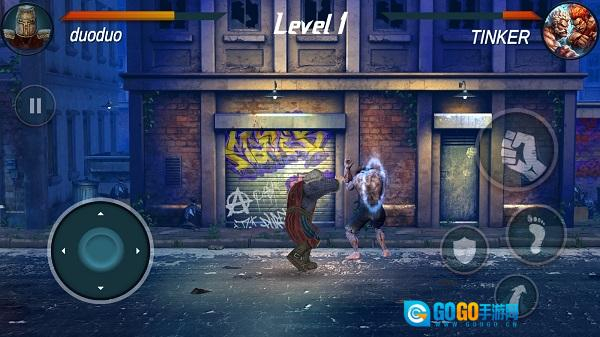 2、操作上沿用虚拟摇杆搭配技能按键的经典设计:左侧摇杆负责角色移动,右侧按键则对应轻拳、重拳、轻脚、重脚攻击,以及防御和若干特殊技能。