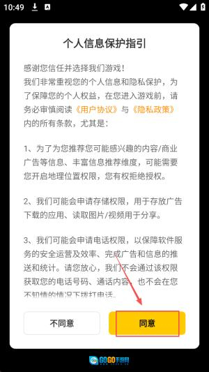 1、同意协议:阅读个人信息保护指引后点击“同意”进入游戏。