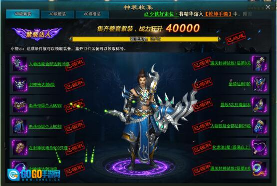 大概40级时会解锁“神装收集”功能,完成前面那些任务就能获得一套紫色装备。