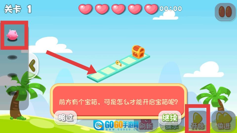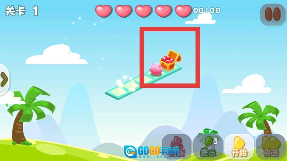 玩家需要操控图中红框所示的粉色小猪角色,通过点击或滑动屏幕控制角色移动方向,收集钥匙并开启宝箱。