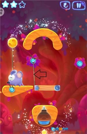 7、按照箭头所指的方向,切断糖果的绳子,最后老鼠就会吃掉糖果,顺利通过这一关。