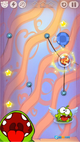 3、吹动葫芦,帮助小猪吃到最顶端的星星,并且按照箭头的指引割断绳子。