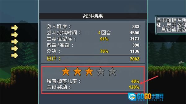 4、战斗胜利后可获得【40%-稀有掉落几率】与【120%-金钱奖励】,高评价结算能提升资源获取收益。