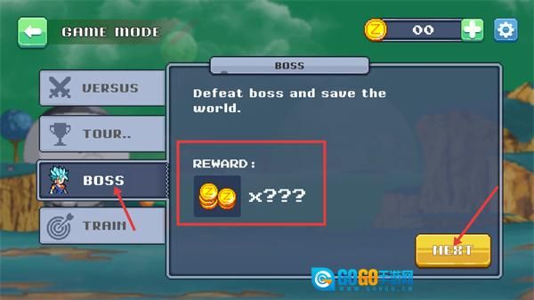 1、选择【BOSS】模式,目标为击败BOSS拯救世界,完成后可获取【REWARD】对应的金币奖励。
