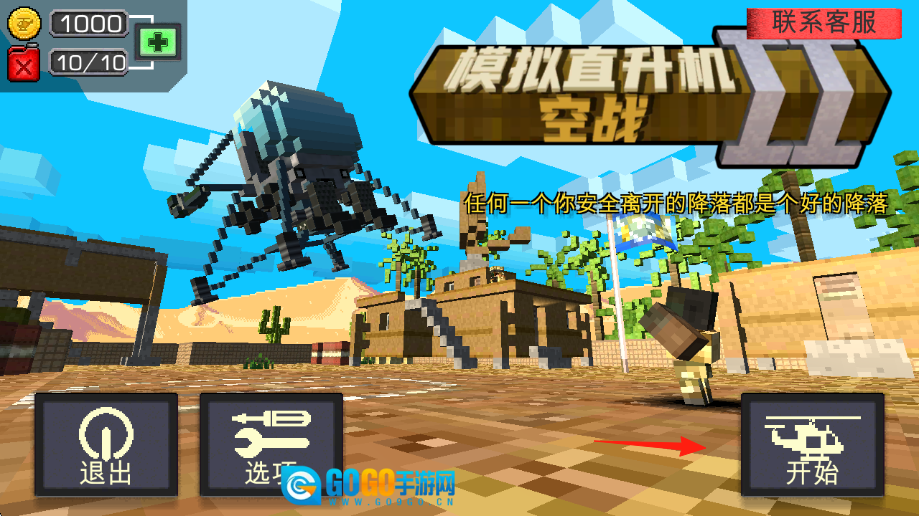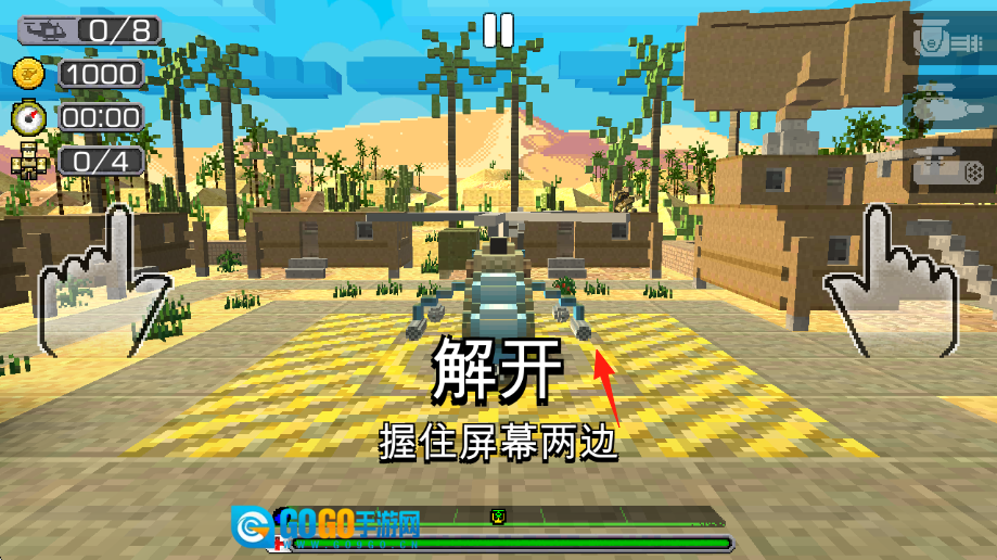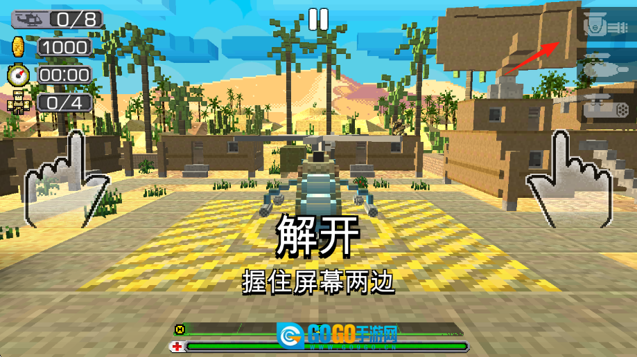 点击【开始】按钮(显示为红色箭头图标),进入沙漠场景后,按照指引提示,用双指分别按住屏幕两侧,通过滑动操作控制直升机移动,完成“解开”环节的教学任务。