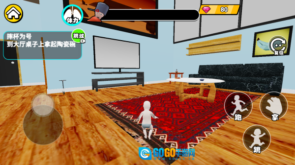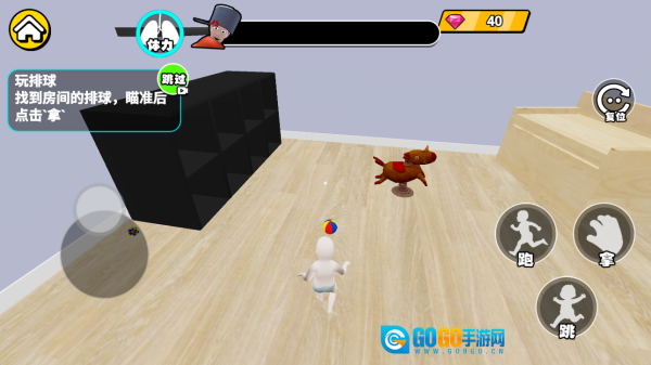 你可以通过虚拟摇杆操控小宝贝在家中四处移动,当靠近那些会发光的物品时,只需点击互动按钮就能和它们玩耍啦,比如打排球、骑摇摇马、翻看绘本之类的。