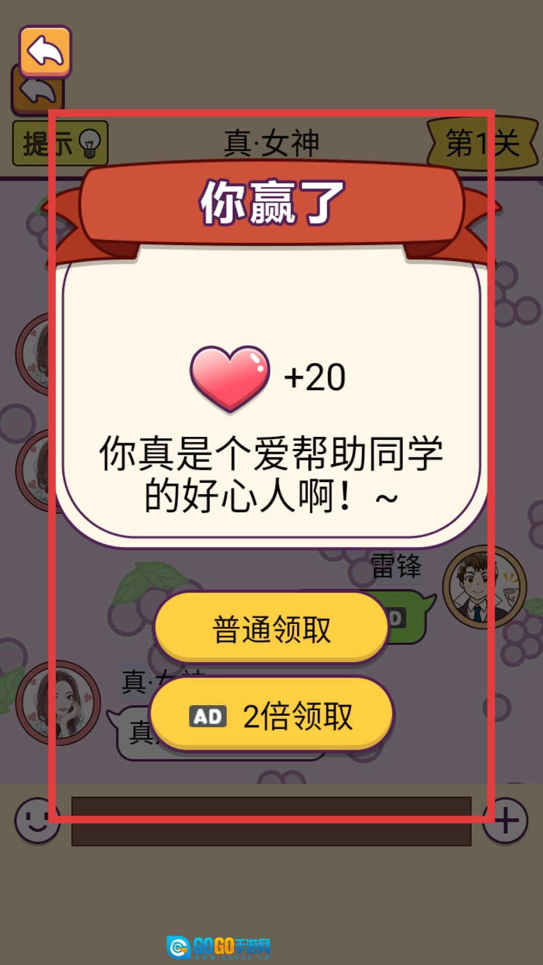 返回后继续聊天,聊天结束后界面显示你赢了的奖励提示,获得爱心值,点击普通领取按钮,领取奖励。