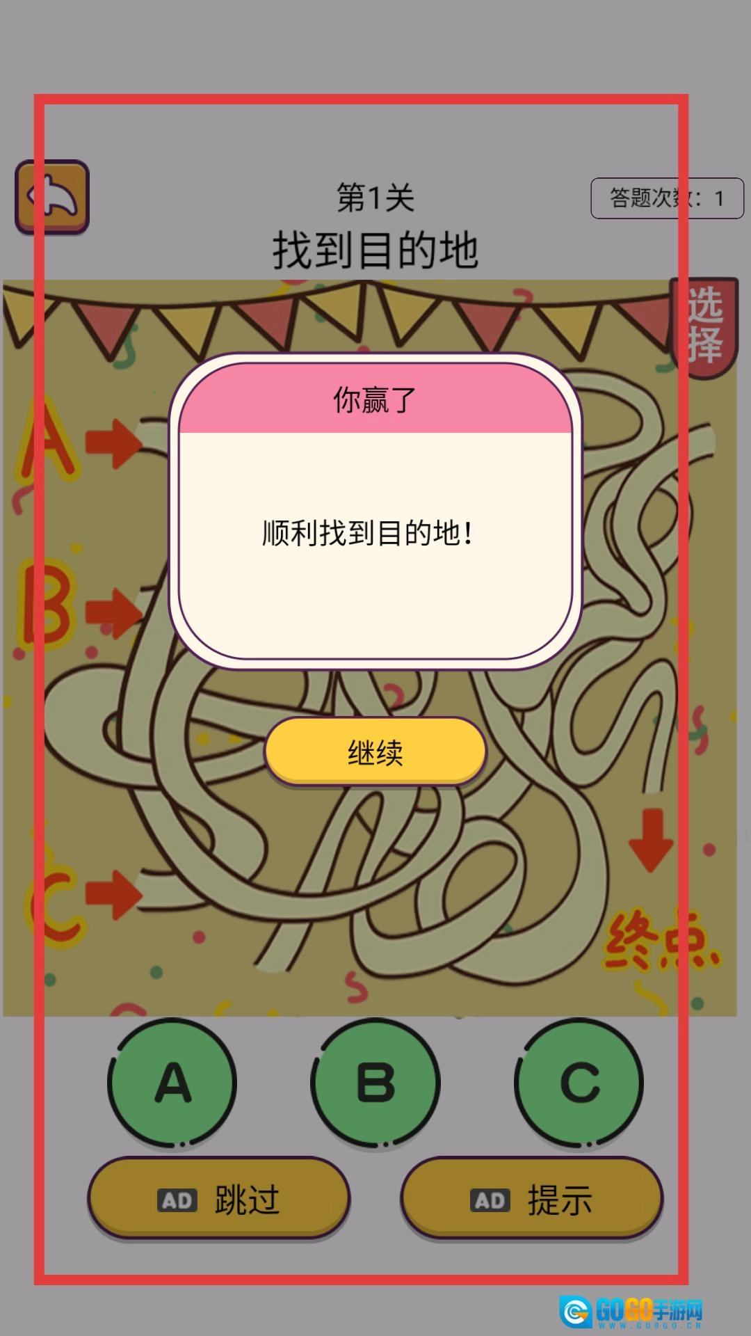 点击选项A后,会进入寻找目的地的迷宫关卡界面,该界面呈现迷宫地图以及三个方向选项,选择正确方向并成功找到目的地后,点击继续按钮即可返回聊天关卡相关界面。