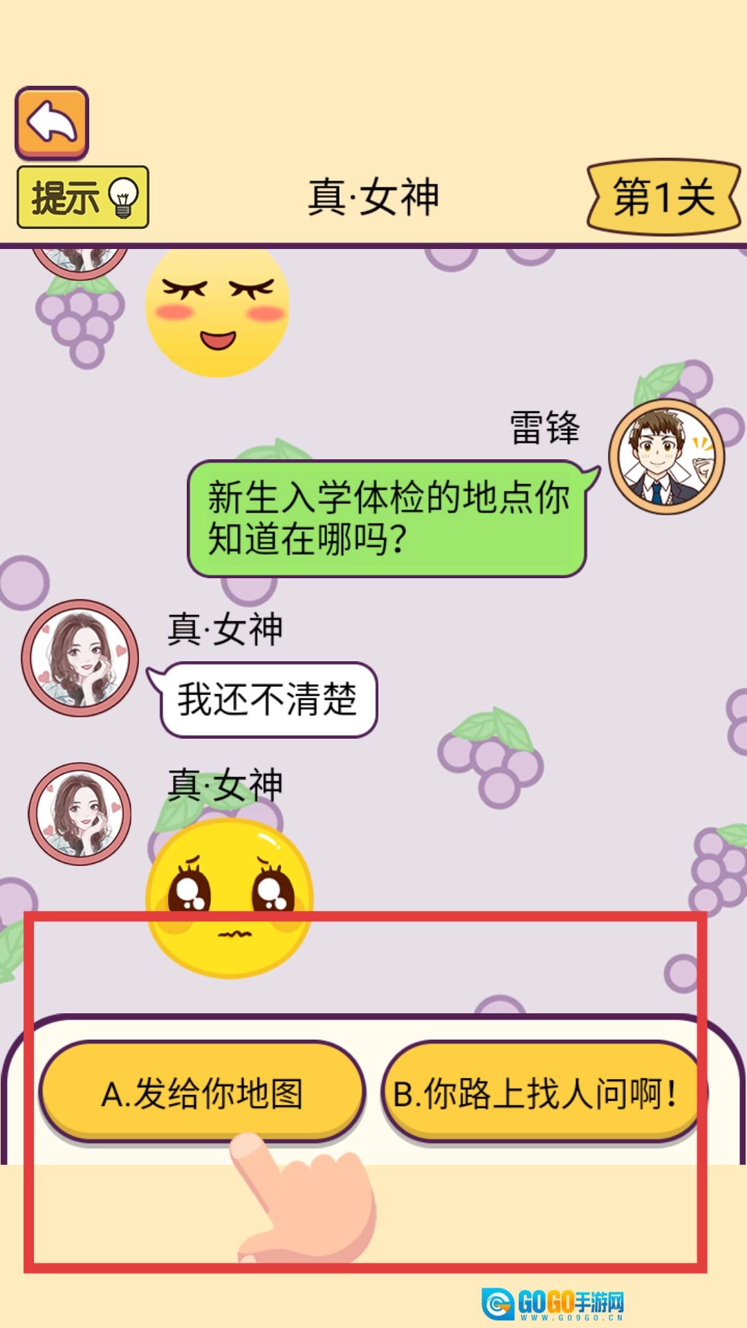 进入第一关的聊天关卡界面后,界面上会呈现出聊天对话内容,下方还会出现两个选项。此时,你可以依据游戏给出的提示,或者凭借自己的判断,点击选项A,以此来推动聊天剧情的发展。