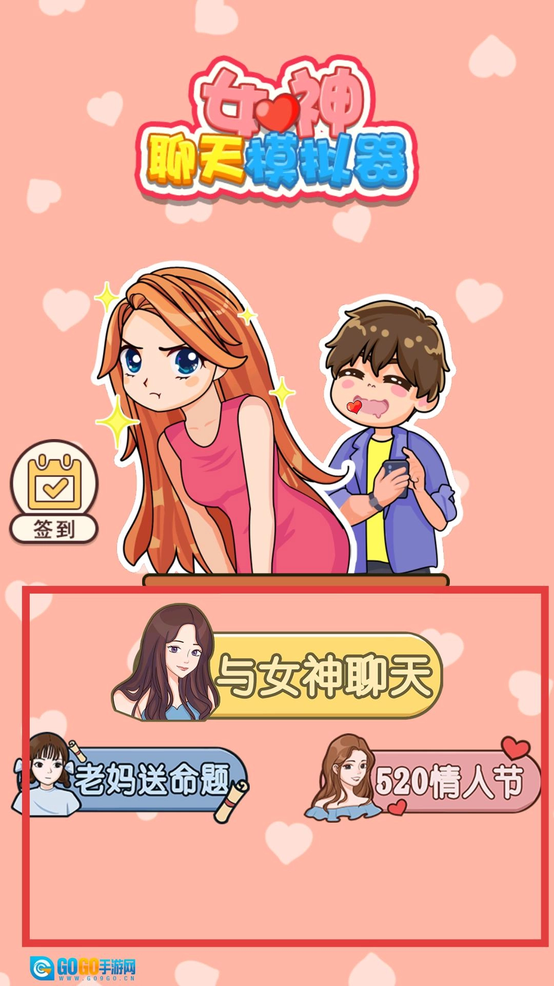 打开女神聊天模拟器后进入主界面,这里能看到与女神聊天、老妈送命题、520情人节等功能选项,另外还有一个签到按钮。当点击“与女神聊天”这个选项时,就会进入聊天关卡界面。