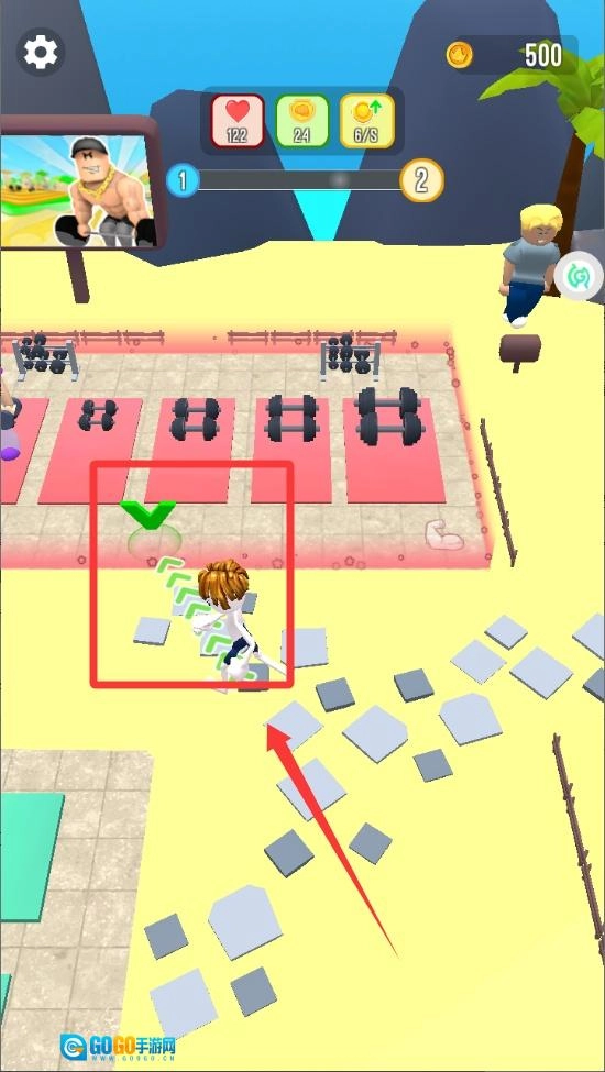 使用虚拟摇杆操控角色移动至地图上标注的训练场区域,当靠近器械时,系统会自动触发训练准备动作。