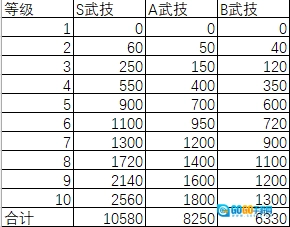 我们能清楚发现,S武技的消耗大于A武技,A武技的消耗又大于B武技;而且武技升到5级相对简单,但5级之后所需的武技点会大幅增加。所以在开荒初期武技点紧张时,建议优先将每个武技都点到5级,这样就能让战斗力达到最大,而非只把单个武技点到10级。