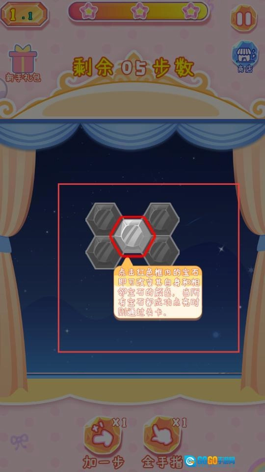 点击红框内的目标宝石,可改变自身及相邻宝石的颜色,需规划好点击顺序,使所有宝石都能成功染色。