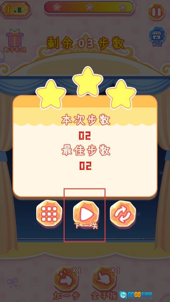 每关结束后会依据步数评定星级,点击下一关即可开启新的挑战,还能借助道具来协助完成染色任务。