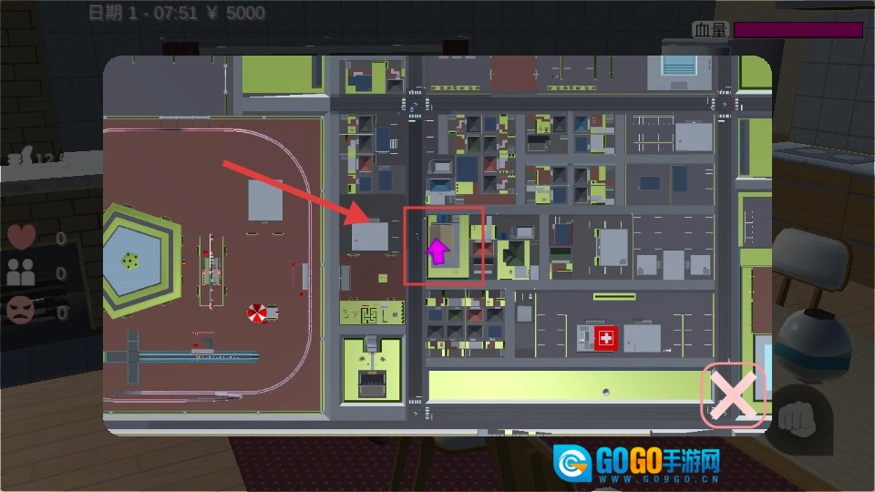 点击左上角的【雷达】按钮就能打开地图,红色框里的紫色箭头所指之处就是目标位置,需要按照提示进行移动。