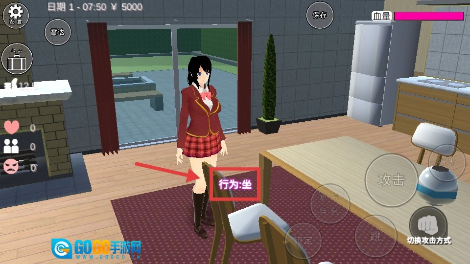 当角色靠近房间里的椅子时,屏幕上会弹出【行为-坐】的提示,点击该提示就能让人物做出坐下的动作。