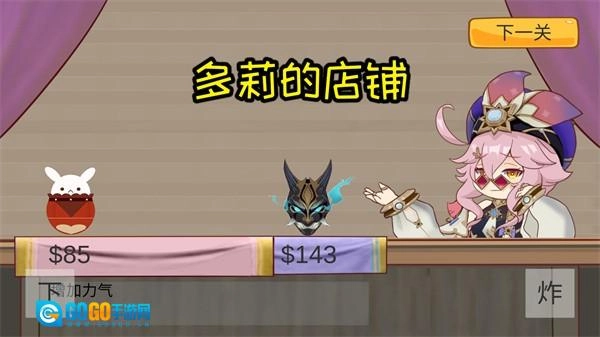 每次通过关卡后,都会遇到由本人出演的奸商多莉,需要查看各个道具的功效来决定是否购买,准备妥当后点击进入下一关。