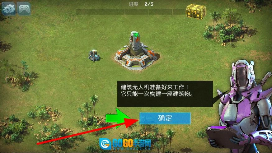 当建筑无人机准备就绪的提示出现时,点击确定按钮。之后使用建筑无人机,挑选合适的地点,逐个建造建筑物,以此为后续的战斗和发展打下基础。