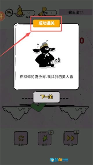 通关之后,点击橙色的“成功通关”按钮,就能查看对话内容。接下来你可以选择“下一关”继续进行游戏,也可以使用底部的“重玩”或者“跳过”功能。