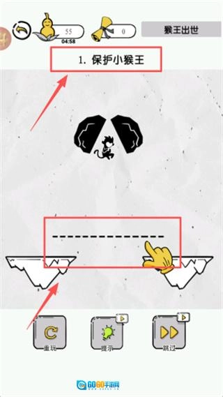 按照红色箭头的指引,点击黄色手掌形状的图标,以此来填补地面上的裂缝,从而保护黑色的小猴王不被龙卷风卷走,达成保护任务的目标。