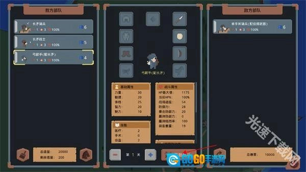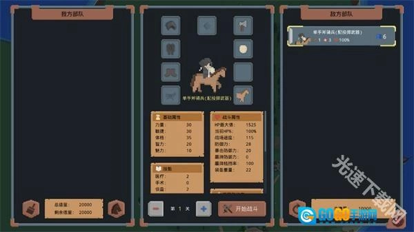 右边浅蓝色的士兵代表可配置,灰色士兵需要达到一定等级后才能配置。我方部队配置完成后,点击开始战斗。
