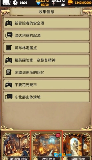 7、要是想了解新手冒险者应当知晓的事项,或是附近树林与洞穴的相关传闻,我们可以点击【收集信息】进行查看。