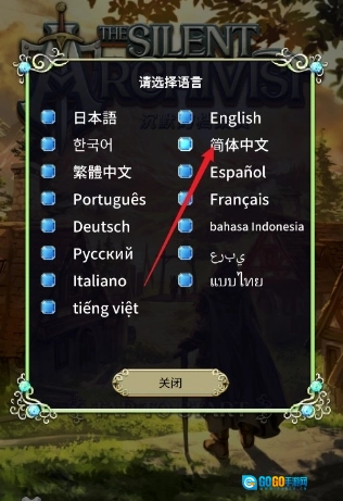 2、在这里能够选择语言,我们选的就是【中文简体】,接着点击【关闭】按钮,回到游戏的初始页面,再点击【TAP TO START】,就可以开始进入游戏了。