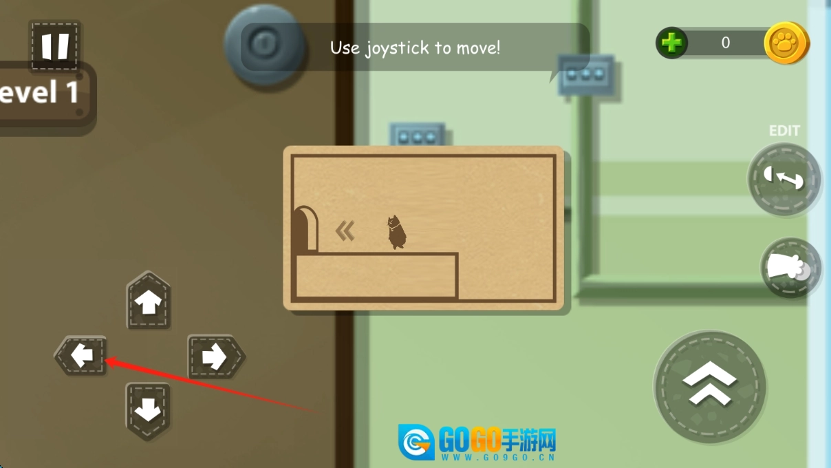 你可以通过左下角的摇杆来操控猫咪的移动方向,当你向左操作摇杆时,猫咪就会在木板搭建的场景里进行探索,逐步靠近那些关键的区域。