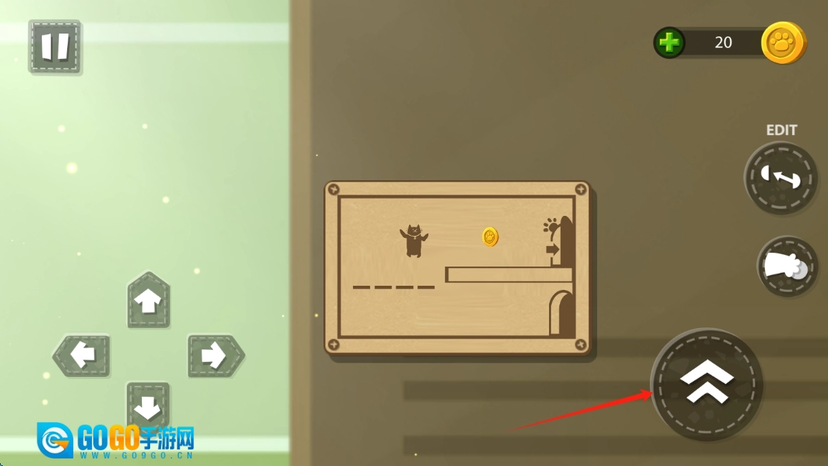 在下方的木板场景里,点击右侧的箭头按钮,帮助猫咪越过障碍,收集金币并到达目标位置。