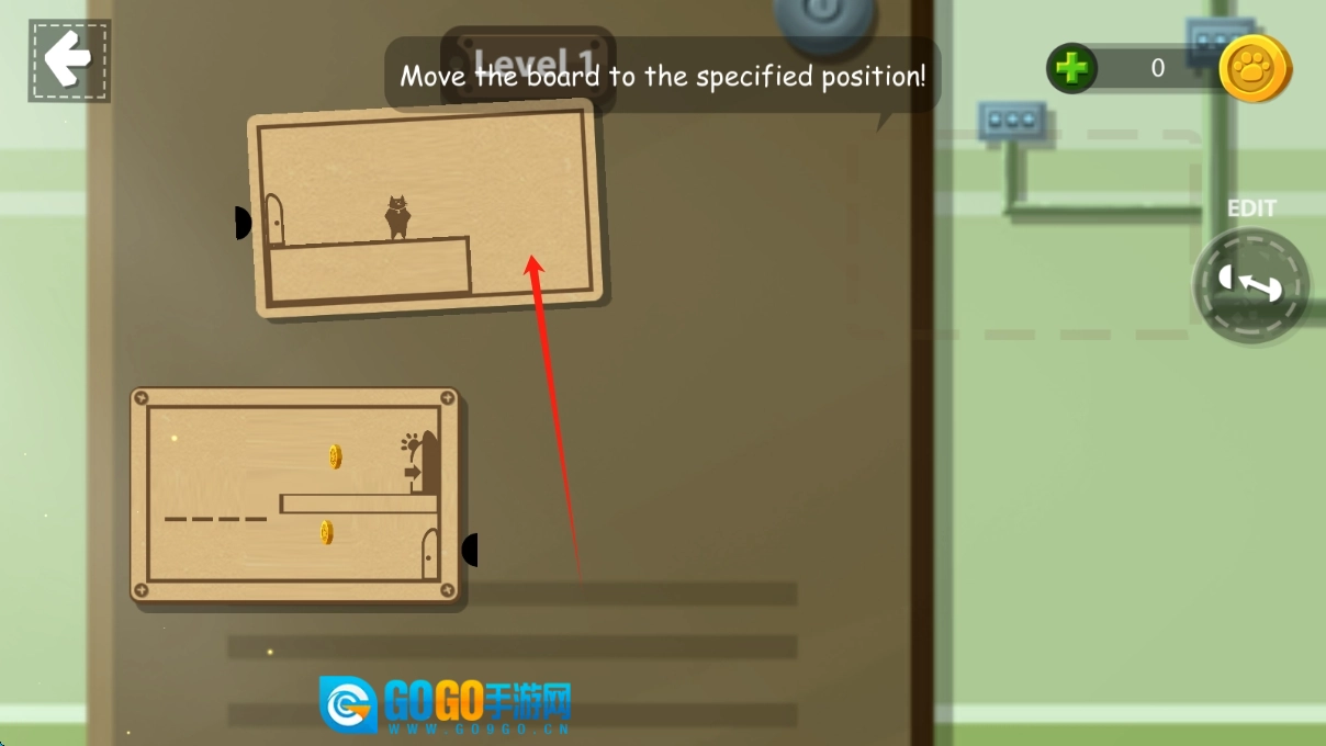 按照提示把上方的木板移到指定的地方,搭建好关卡一开始的通路,给猫咪的行动打造基础环境。