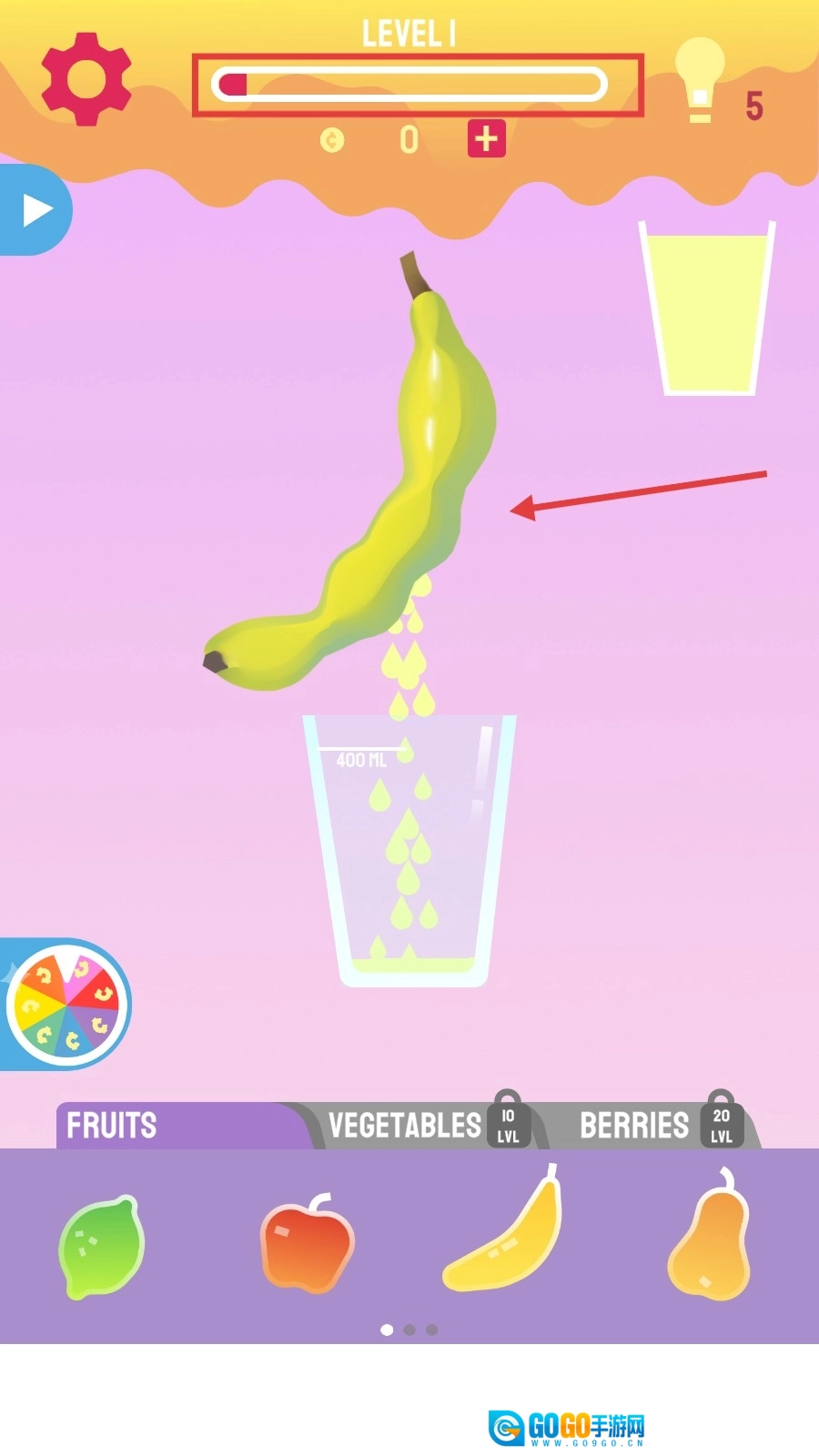 按压你选中的香蕉,使果汁滴进杯子里,注意观察上方的进度条,当果汁的量和目标一致时就可以了。