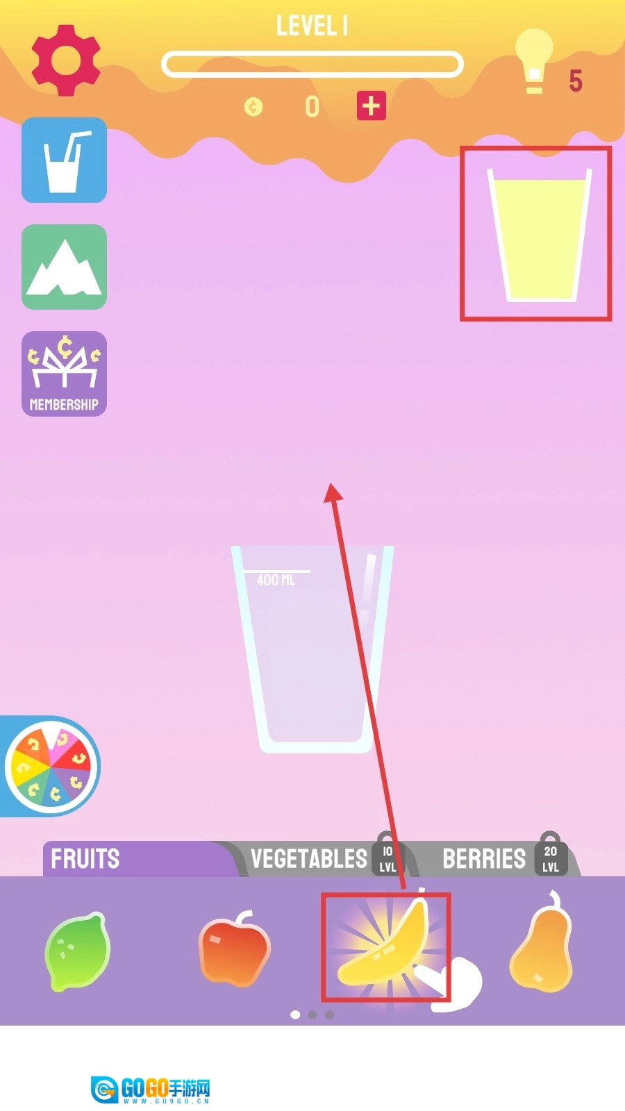 观察右上角的目标饮品,接着从下方的【FRUITS】栏里挑选对应的水果,比如这一关要选香蕉,然后把它拖到上方的杯子那里。
