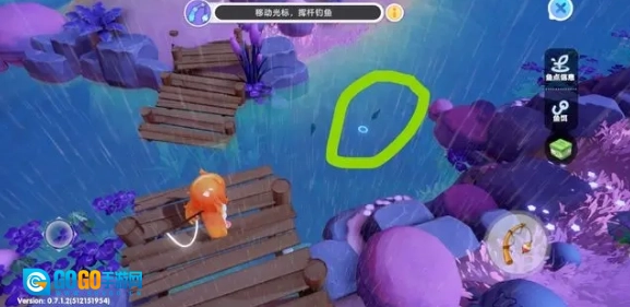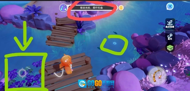 第二步:借助左侧方向键(绿圈标注处)将光标(右侧绿圈所指)移到目标鱼的前方位置,注意保持合适的距离,避免惊扰到鱼。就算不小心惊到了鱼也没关系,过一会儿还会有别的鱼咬钩的。