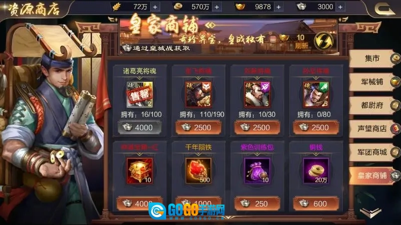 平民前期别盲目购物,把元宝多存起来,大概一周左右就能凑够直接兑换一个15资武将的数量了。