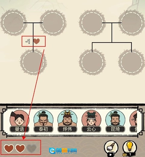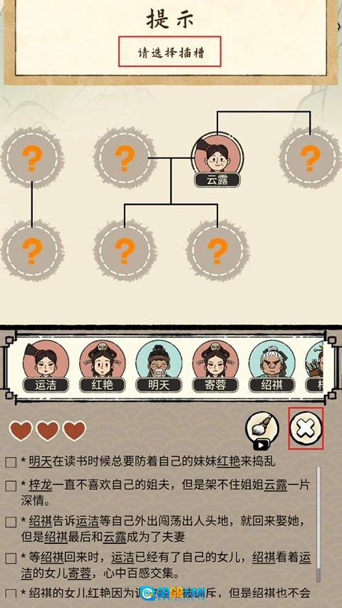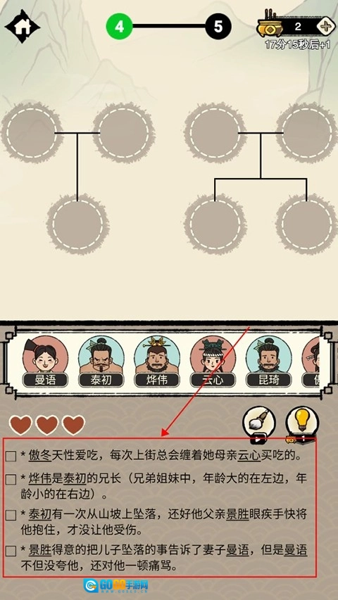 进入关卡后,玩家要依据下方的文字提示,把人物头像拖拽到上方对应的圆框里,以此完成族谱的修缮工作。