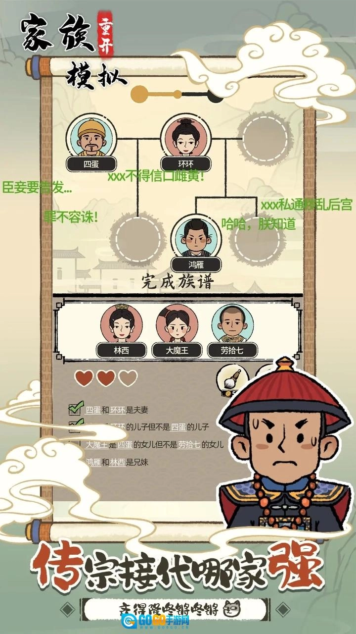 家族重开模拟是一款益智解谜类游戏,在游戏中,玩家将化身大家族中的一员,通过一代又一代的繁衍不息来开枝散叶,同时还要探寻其他族人的身份与所在之处,逐步完善家族的家谱,以此来闯过一关又一关。此外,玩家还能够在游戏里经商,收集各类资源去建造属于自己的产业,让家族不断发展壮大。