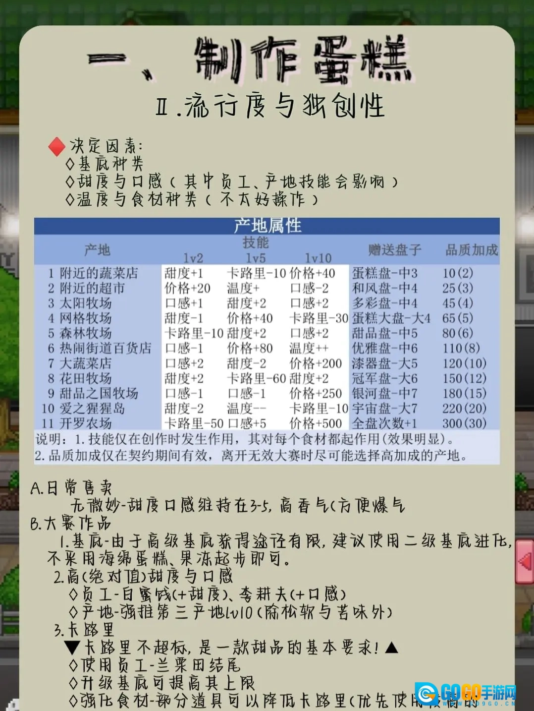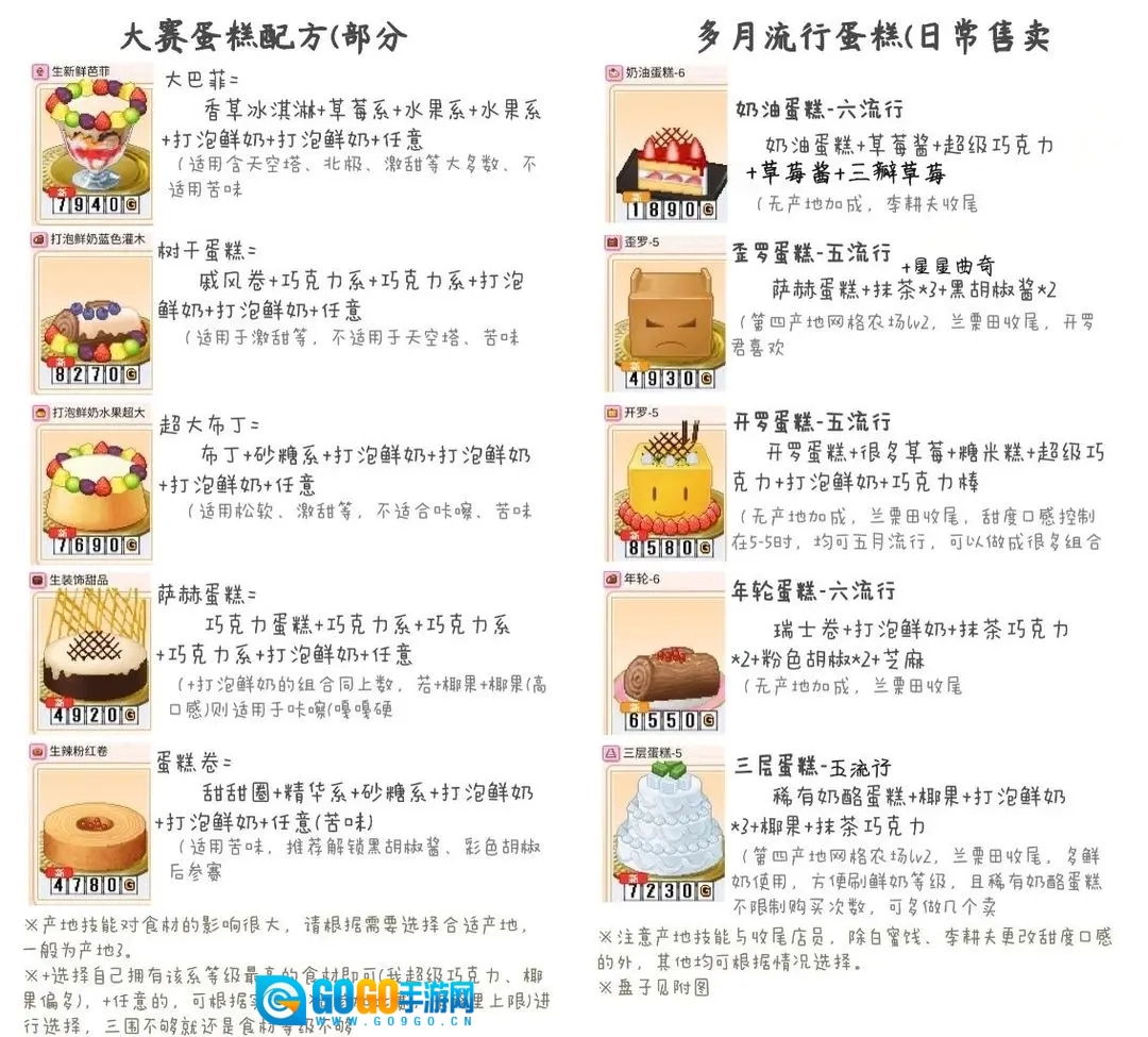 日常推荐第四产地(降甜度)和第五产地(减卡路里),技能仅在创作过程中生效,品质加成则在契约期间持续发挥作用。选好合适的产地制作甜点后,记得回到品质加成最高的地方参加比赛,产地配方升级所需材料为:普通盘+果冻+打泡鲜奶×3