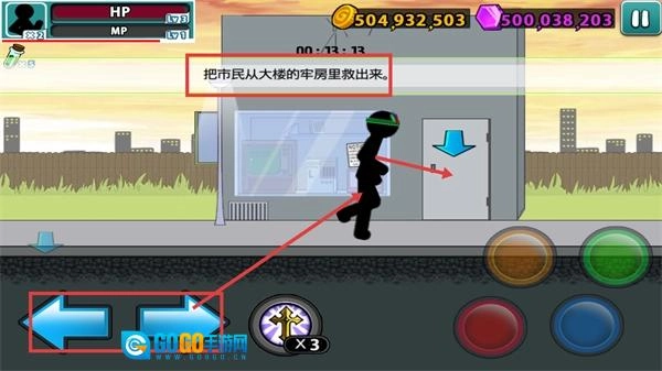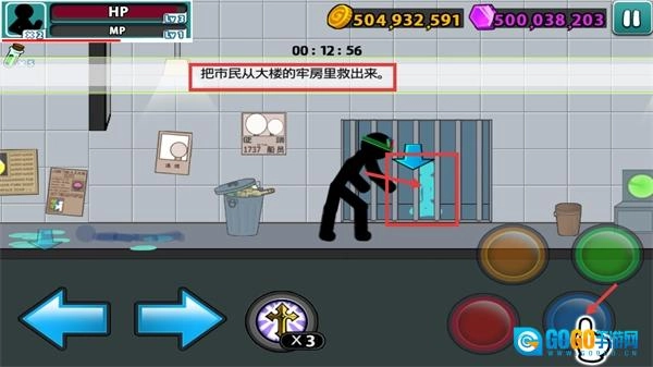 进入牢房区域后,按下红色攻击键击倒敌人,靠近蓝色市民剪影就能完成救援相关的交互操作。